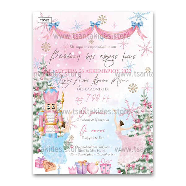 Χριστουγεννιάτικο προσκλητήριο βάπτισης για κορίτσι με θέμα Καρυοθραύστης και Μπαλαρίνα . Το προσκλητήριο διατίθεται σε κάρτα με φάκελο σε χρώμα της επιλογής σας από τους αναγραφόμενους κωδικούς.