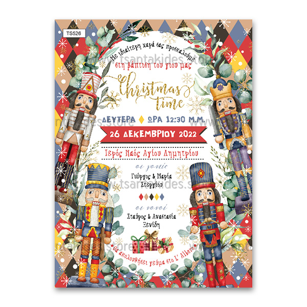 Χριστουγεννιάτικο προσκλητήριο βάπτισης για αγόρι με θέμα Nutcracker. Το προσκλητήριο διατίθεται σε κάρτα με φάκελο σε χρώμα της επιλογής σας από τους αναγραφόμενους κωδικούς.