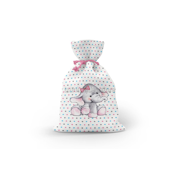 Mπομπονιέρα σε υφασμάτινο πουγκί με θεματική το Ελεφαντάκι Κορίτσι Δίδυμα.