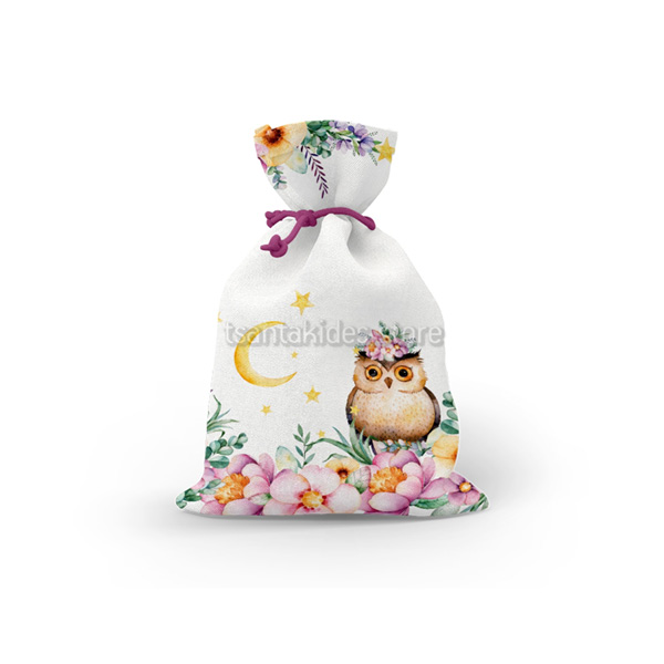 Mπομπονιέρα σε υφασμάτινο πουγκί με Θεματική την Κουκουβάγια.