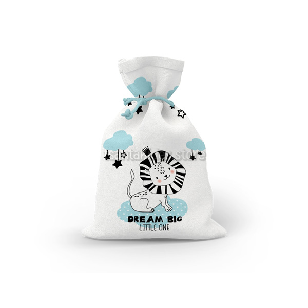 Mπομπονιέρα σε υφασμάτινο πουγκί με θεματική το Λιονταράκι.