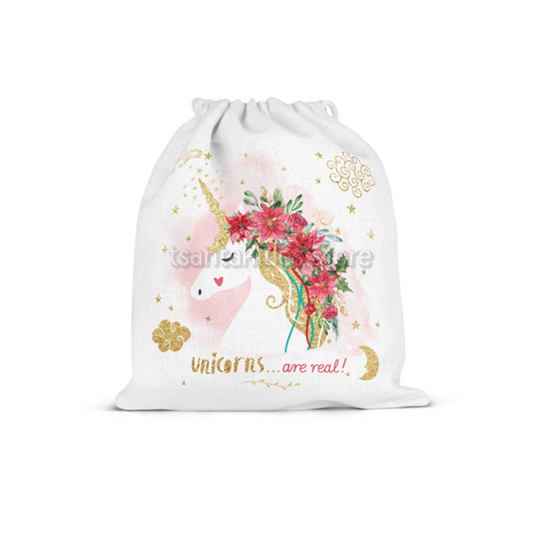Υφασμάτινο πουγκί δώρου εκτυπωμένο με θέμα το Μονόκερος Χριστουγέννων.