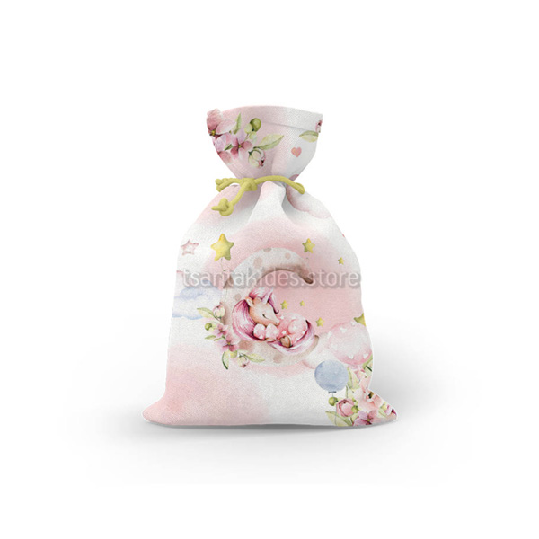 Mπομπονιέρα σε Υφασμάτινο πουγκί με Θεματική το Μονόκερος στα Σύννεφα.