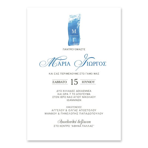 Μοντέρνα πρόσκληση γάμου κάθετης διάταξης, σε μπλε εκπληκτικούς χρωματισμούς και μονογράμματα. Τυπώνεται σε πολυτελές χαρτί και συνοδεύεται από φάκελο.