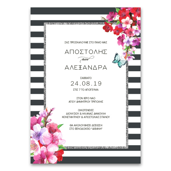 Από την ανθική συλλογή προσκλητηρίων, ένα ξεχωριστό μοναδικό σχέδιο. Τυπωμένο σε χαρτί άριστης ποιότητας και περιλαμβάνει ταιριαστό φάκελο.