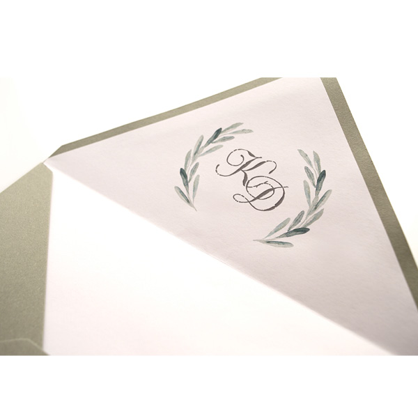 Φάκελος ορθογώνιος λαδί ανοικτό οικολογικό με άγρια υφή εξωτερικά – λείο λευκό εσωτερικά και Κάρτα λευκή ματ με θέμα κλαδιά ελιάς και μονογράμματα.