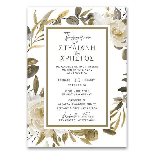 Ένα εκπληκτικό προσκλητήριο γάμου floral ύφους έτοιμο να διακοσμήσει τα ονόματά σας. Τυπώνεται σε χαρτί αρίστης ποιότητας και περιλαμβάνει πολυτελές φάκελο.