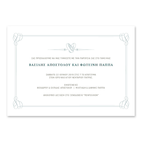 Μία σύνθεση με κλασικές βέρες είναι έτοιμη να διακοσμήσει τα ονόματά σας. Τυπώνεται σε πολυτελές χαρτί και συνοδεύεται από ταιριαστό φάκελο.