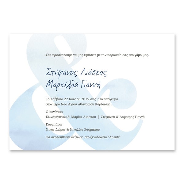 Πρωτότυπο προσκλητήριο με ampersand, αλλά και τολμηρό χρωματισμό, οριζόντιας διάταξης. Τυπώνεται σε πολυτελές χαρτί και συνοδεύεται από φάκελο.