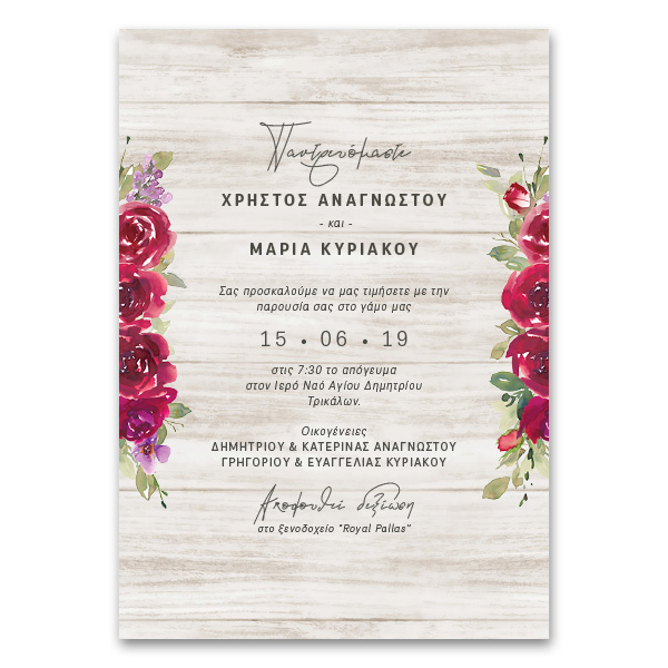 Ένα ρουστίκ σχέδιο σε εντυπωσιακό χρωματισμό για το γαμήλιο προσκλητήριο. Τυπώνεται σε χαρτί άριστης ποιότητας και περιλαμβάνει πολυτελές φάκελο.
