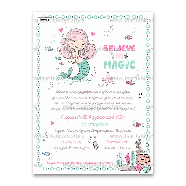 Προσκλητήριο βάπτισης για κορίτσι με θέμα τη γοργόνα στο βυθό. Το προσκλητήριο είναι τυπωμένο σε λευκό ματ χαρτί. Το προσκλητήριο διαθέτει φάκελο σε χαρτί της επιλογής σας από τους αναγραφόμενους κωδικούς.