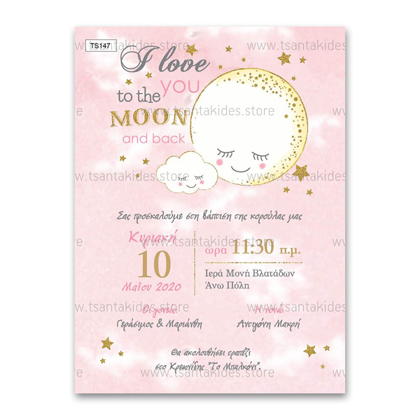 Προσκλητήριο βάπτισης για κορίτσι με θέμα το φεγγαράκι. Το προσκλητήριο είναι τυπωμένο σε λευκό ματ χαρτί. Το προσκλητήριο διαθέτει φάκελο επιλογής σας από τους αναγραφόμενους κωδικούς.