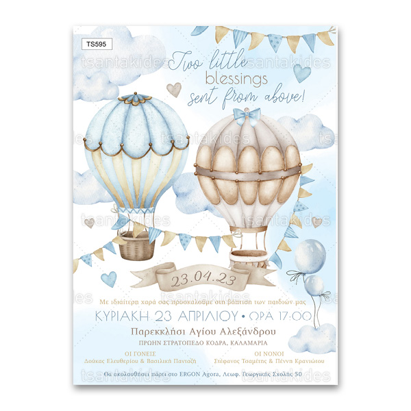 Προσκλητήριο βάπτισης για δίδυμα με θέμα Baby Boys Hot Air Balloon. Το προσκλητήριο διατίθεται σε κάρτα με φάκελο σε χρώμα της επιλογής σας από τους αναγραφόμενους κωδικούς.