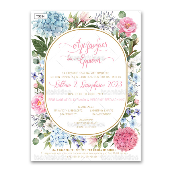 Προσκλητήριο Γάμου floral με γαλάζιες και ροζ ορτανσίες