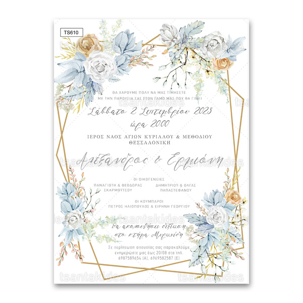 Προσκλητήριο γάμου με dusty blue λουλούδια και χρυσό γεωμετρικό σχήμα. Το προσκλητήριο διατίθεται σε κάρτα με φάκελο σε χρώμα της επιλογής σας από τους αναγραφόμενους κωδικούς.
