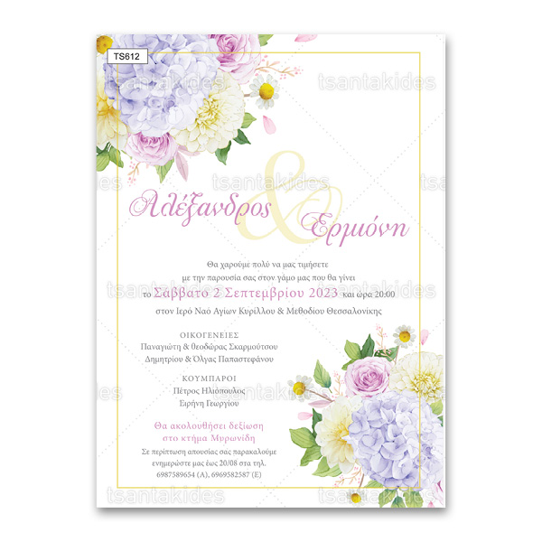 Προσκλητήριο Γάμου με floral ρομαντικές ορτανσίες και χαμομήλι