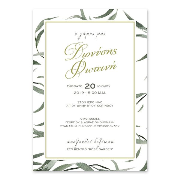 Σύγχρονη κλασική πρόσκληση με περίγραμμα από υπέροχα φύλλα σε πράσινες αποχρώσεις. Τυπώνεται σε πολυτελές χαρτί και συνοδεύεται από φάκελο.