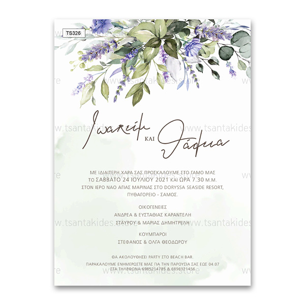 Προσκλητήριο γάμου με greenery στοιχεία και λεβάντα. Το προσκλητήριο διατίθεται σε κάρτα με φάκελο σε χρώμα της επιλογής σας από τους αναγραφόμενους κωδικούς.