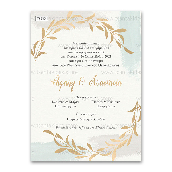 Προσκλητήριο γάμου με λιτό, chic σχεδιασμό, watercolor και χρυσά κλαδιά. Το προσκλητήριο διατίθεται σε κάρτα με φάκελο σε χρώμα της επιλογής σας από τους αναγραφόμενους κωδικούς.