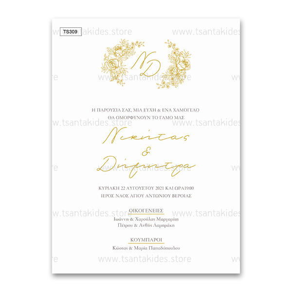Προσκλητήριο γάμου με λιτό σχεδιασμό και χρυσές λεπτομέρειες. Το προσκλητήριο διατίθεται σε κάρτα με φάκελο σε χρώμα της επιλογής σας από τους αναγραφόμενους κωδικούς.