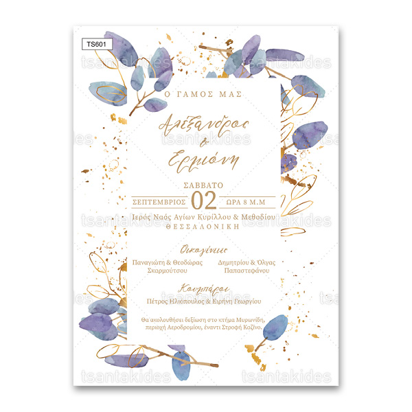 Προσκλητήριο γάμου με μωβ χρωματισμούς και χρυσές λεπτομέρειες. Το προσκλητήριο διατίθεται σε κάρτα με φάκελο σε χρώμα της επιλογής σας από τους αναγραφόμενους κωδικούς.