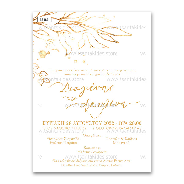 Προσκλητήριο γάμου με θέμα Gold Foil. Το προσκλητήριο διατίθεται σε κάρτα με φάκελο σε χρώμα της επιλογής σας από τους αναγραφόμενους κωδικούς.