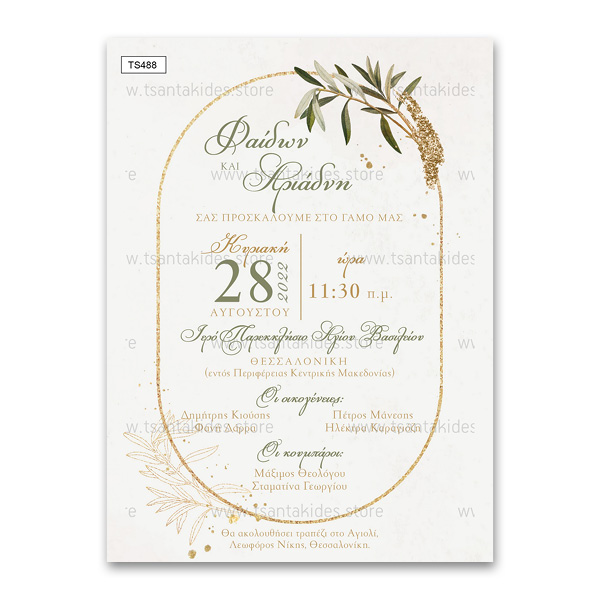 Προσκλητήριο γάμου με θέμα Gold Olive Brush. Το προσκλητήριο διατίθεται σε κάρτα με φάκελο σε χρώμα της επιλογής σας από τους αναγραφόμενους κωδικούς.