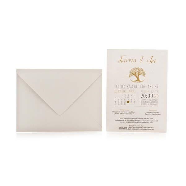 Προσκλητήριο γάμου συνοδευόμενο από φάκελο ορθογώνιο γκοφρέ γραμμωτό γκρι ανοικτό και κάρτα γκοφρέ γραμμωτή υπόλευκη με θέμα δένδρο ζωής, ημερολόγιο.