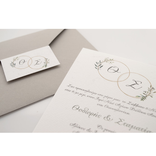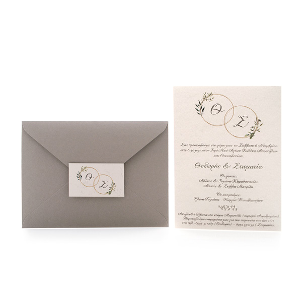 Φάκελος ορθογώνιος οικολογικός γκρι με άγρια υφή και κάρτα μπιμπικωτή λευκή με θέμα βέρες και λουλούδια.