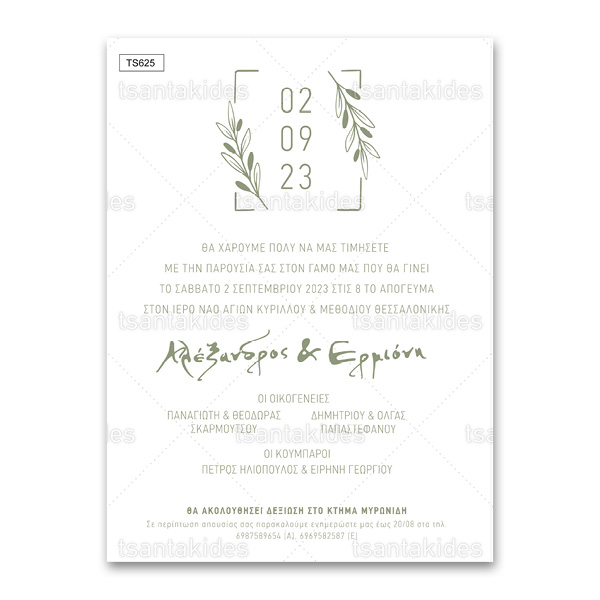 Προσκλητήριο Γάμου λαδί με ημερομηνία και κλαδιά ελιάς