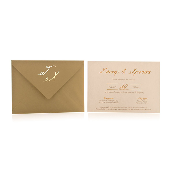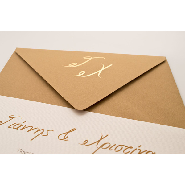 Προσκλητήριο γάμου συνοδευόμενο από φάκελο ορθογώνιο οικολογικό κραφτ με άγρια υφή ματ με μονογράμματα χρυσοτυπία και Κάρτα γκοφρέ γραμμωτή υπόλευκη.