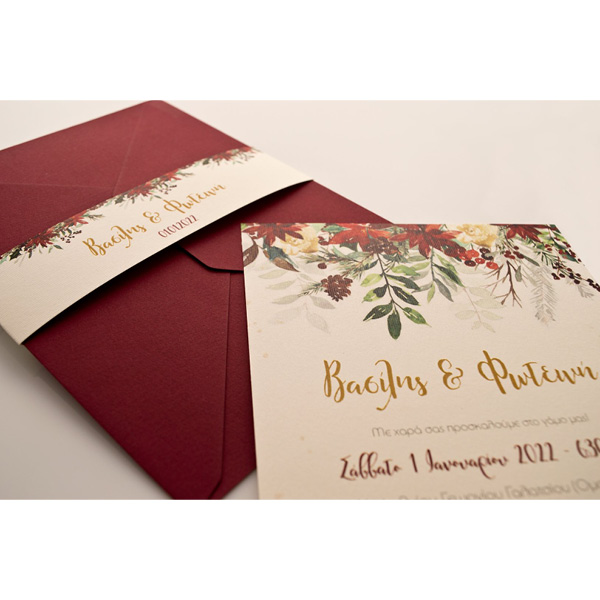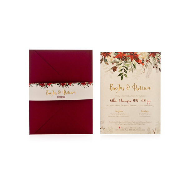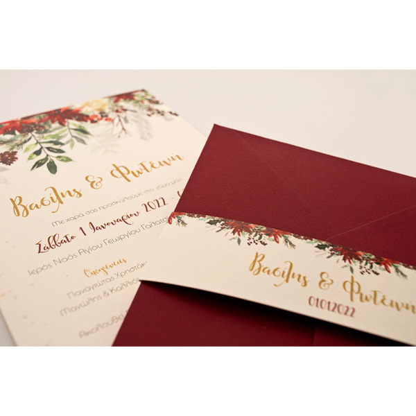 Προσκλητήριο γάμου συνοδευόμενο απο φάκελο ορθογώνιο μπορντώ με φάσα φακέλου με θέμα λουλούδια.