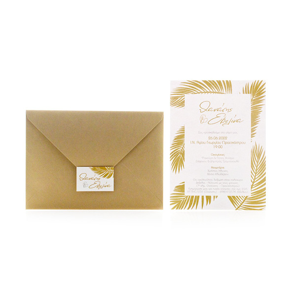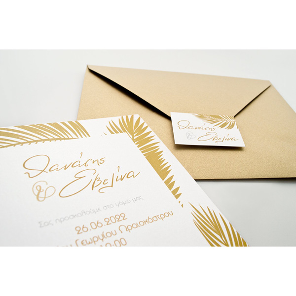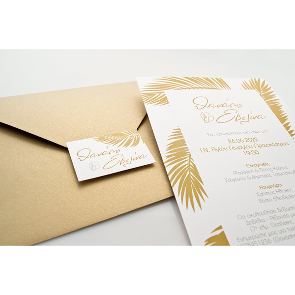Προσκλητήριο γάμου συνοδευόμενο από φάκελο ορθογώνιο περλέ χρυσό και κάρτα περλέ με θέμα φτέρες.