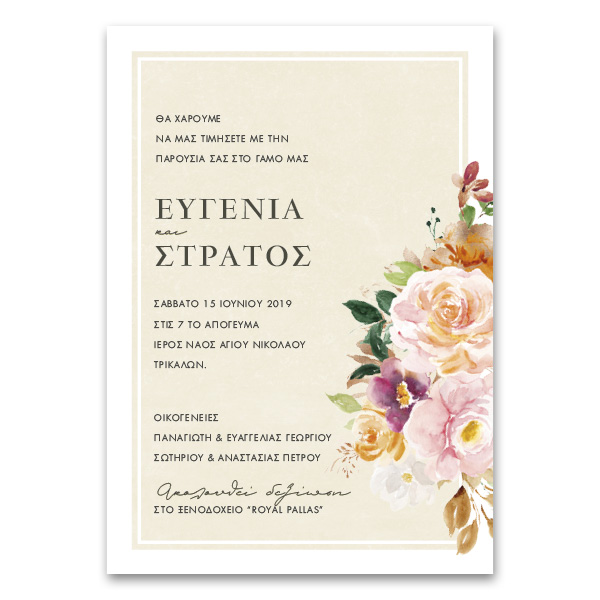 Η ρομαντική εικονογράφηση δημιουργεί ένα ξεχωριστό προσκλητήριο, τυπωμένο σε πολυτελές χαρτί που συνοδεύεται από κομψό φάκελο.
