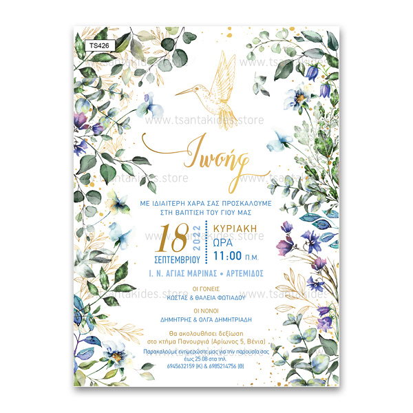 Προσκλητήριο βάπτισης για αγόρι με θέμα Flower Colibri. Το προσκλητήριο διατίθεται σε κάρτα με φάκελο σε χρώμα της επιλογής σας από τους αναγραφόμενους κωδικούς.
