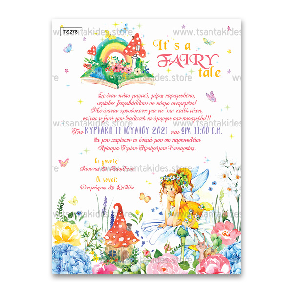 Προσκλητήριο βάπτισης για κορίτσι με θέμα τη νεράιδα στο μαγεμένο δάσος. Το προσκλητήριο είναι τυπωμένο σε λευκό ματ χαρτί. Το προσκλητήριο διαθέτει φάκελο σε χαρτί της επιλογής σας από τους αναγραφόμενους κωδικούς.