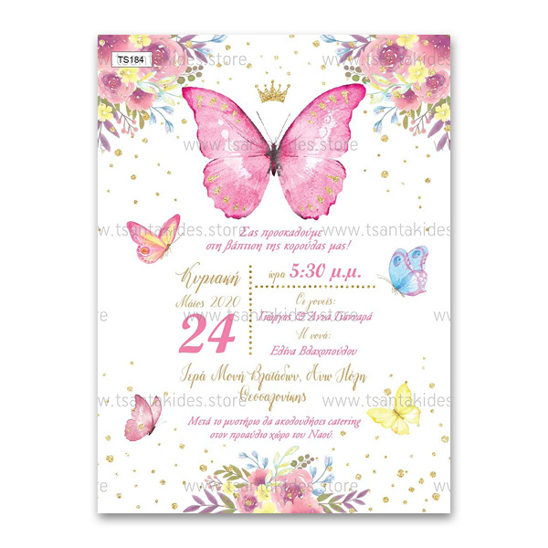 Προσκλητήριο βάπτισης για κορίτσι με θέμα την πεταλούδα. Το προσκλητήριο είναι τυπωμένο σε λευκό ματ χαρτί. Το προσκλητήριο διαθέτει φάκελο επιλογής σας από τους αναγραφόμενους κωδικούς.