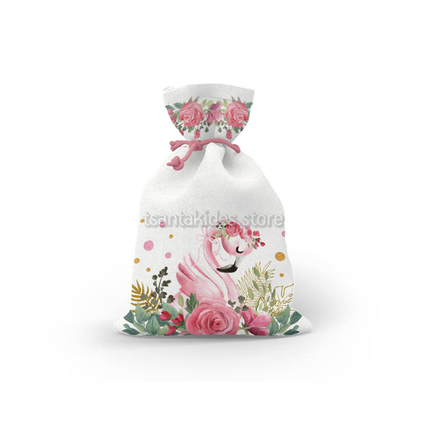 Mπομπονιέρα σε Υφασμάτινο πουγκί με Θεματική το Φλαμίνγκο.