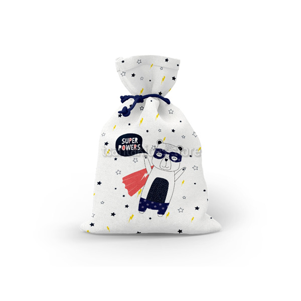 Mπομπονιέρα σε υφασμάτινο πουγκί για αγόρι με θεματική Super Αρκουδάκι.